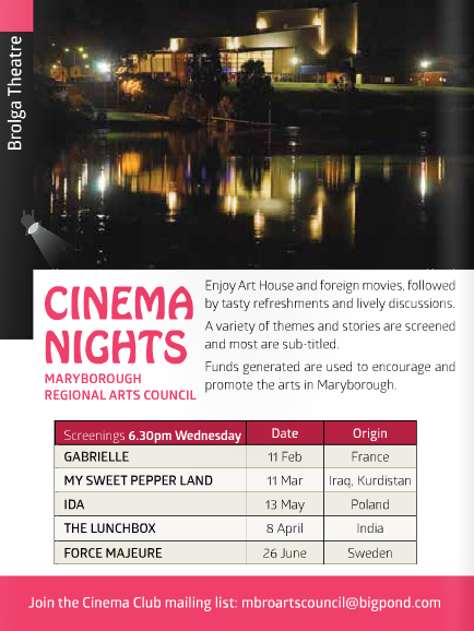 Tickets are $12 for non members or $10 for Maryborough Arts Council members and include wine and nibbles after the film. The movies start at 6.30pm and—a note for newcomers—are shown in the Federation room which you enter from the rear (river side) of the Brolga theatre.